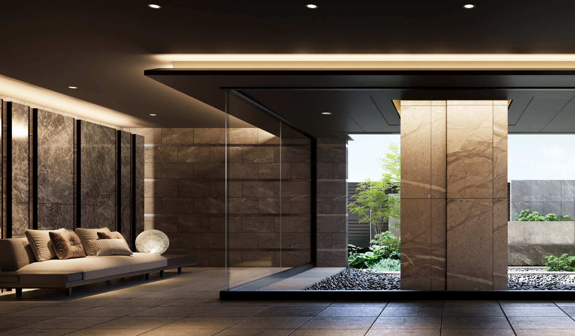 エントランスホールとラウンジに囲まれた空間アートともいえる坪庭。背面から注ぐ自然光、照明デザイン、上質な素材が耽美な佇まいを織りなす。移り変わる光の陰影にまで美を求め、時間の流れをアートとして魅せる。