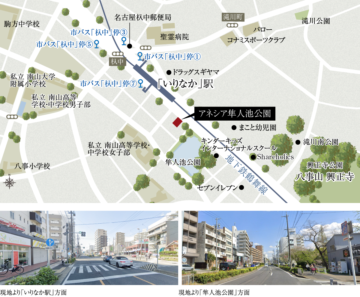 いりなか駅や隼人池公園は歩道が整備されてる平坦なエリア。また各施設へのアクセスも快適。昭和区の中でも起伏が少なく、お子様や高齢の方でも住まいやすい環境と言えます。